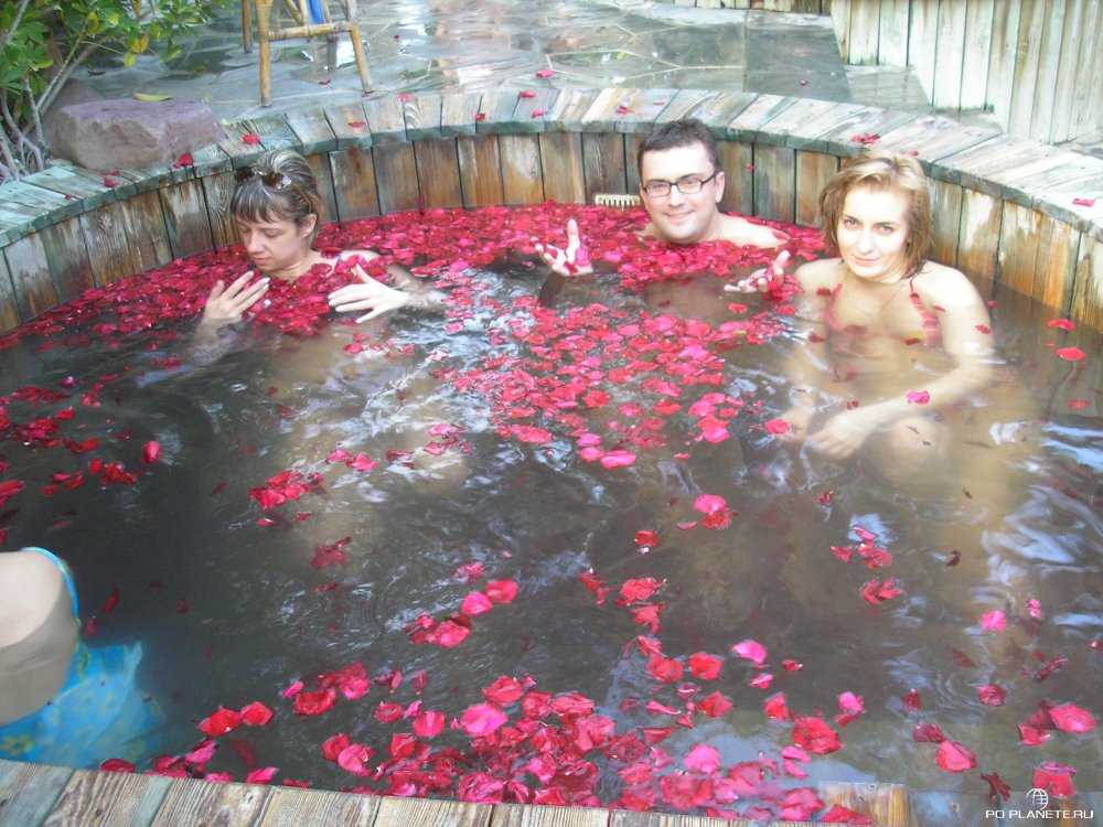 Наконец, попали внутрь. Переоделись и пошли гулять по комплексу. На большой территории разбросано множество небольших ванн и бассейнов, наполненных горячей водой. При этом каждая ванна с добавками. Например, кофе, зеленый чай, вино, лепестки роз.