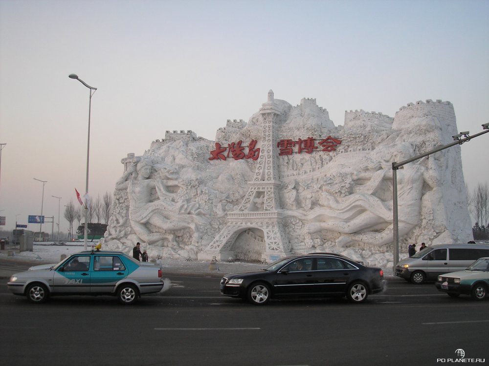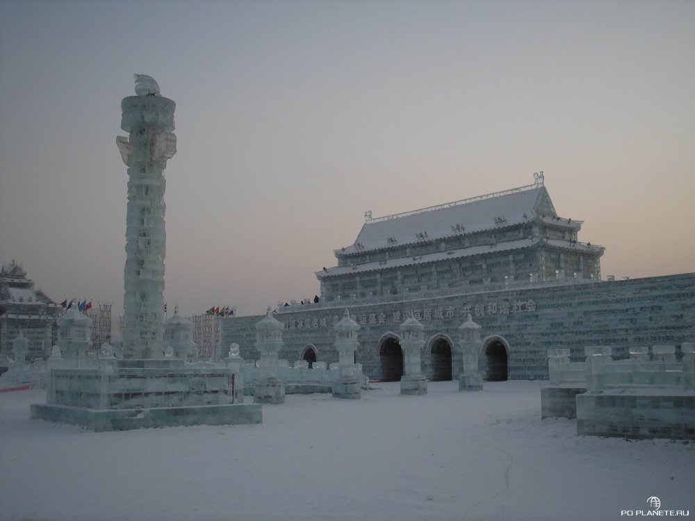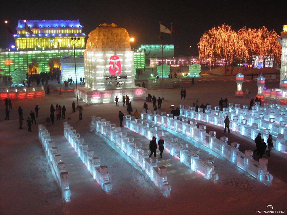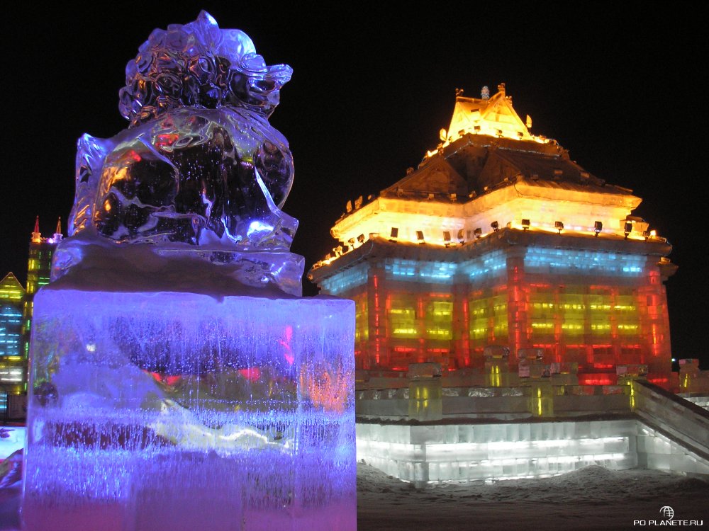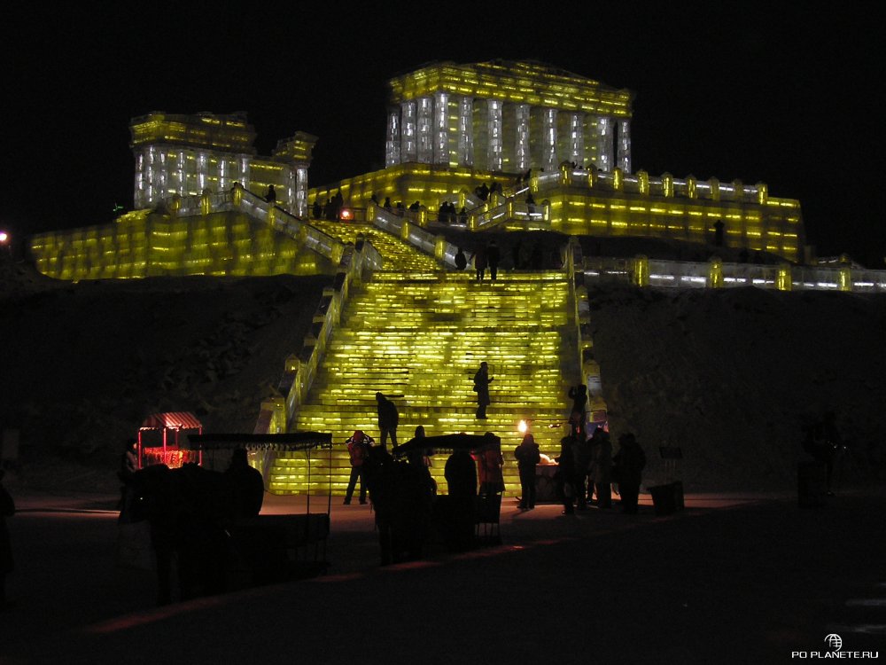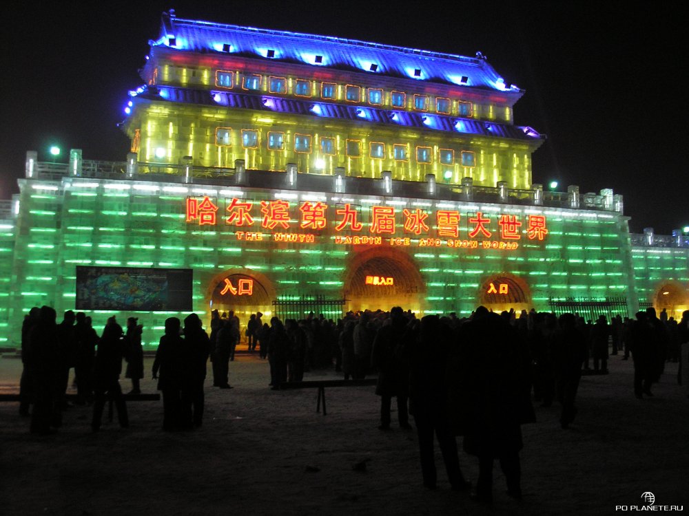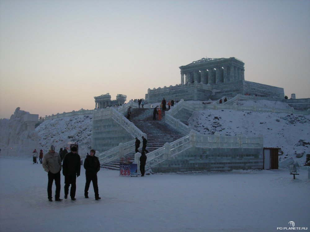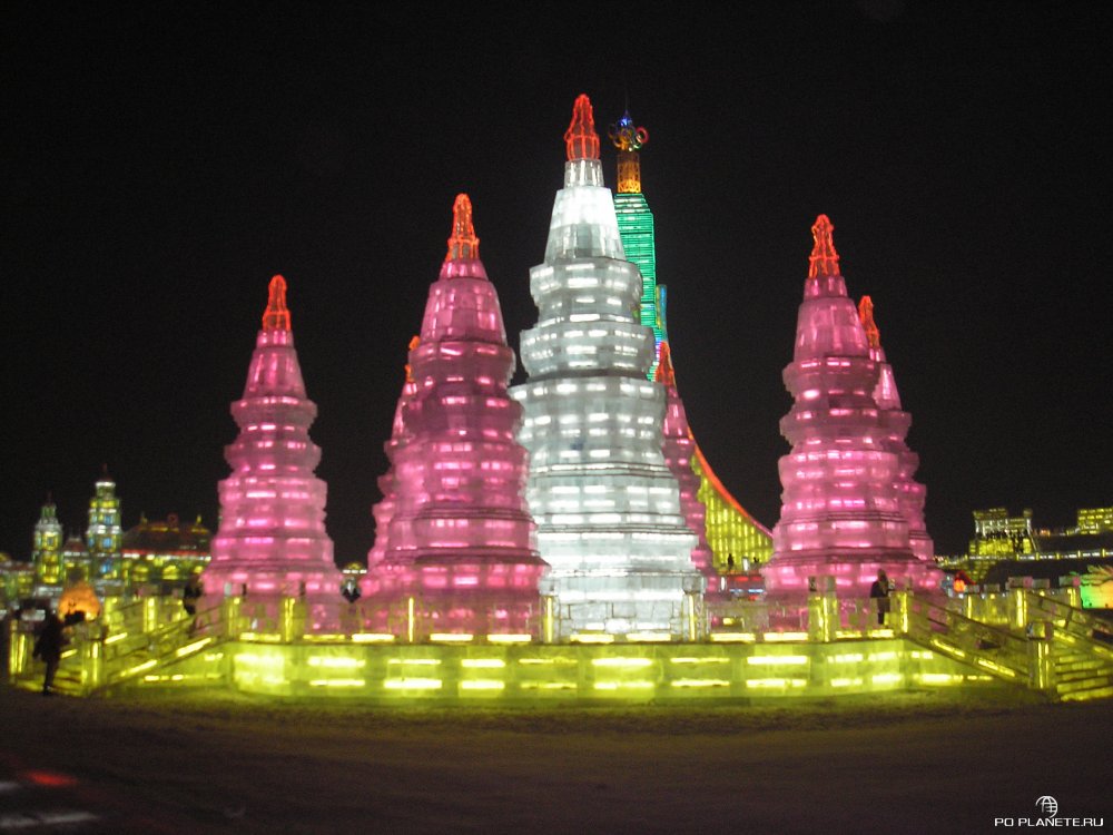 Приехали, как выяснилось, перед самым закрытием. Входной билет стоит 150 юаней, но нас со Стасом «добрые» китайцы пропустили за каких-то 50 юаней с рыла. А Ленку, Никиту и Соню развели по полной программе. Они еще и взяли повозку с лошадкой и прокатились по кругу. Но хоть успели увидеть почти все, пусть и мельком. Мы же пока стояли щелкали клювом и затворами фотоаппаратов, вся эта красота и закончилась. Просто выключили подсветку и попросили всех к выходу. Короче, успел посмотреть только три-четыре ледовых строения. Красиво! Больше добавить нечего.