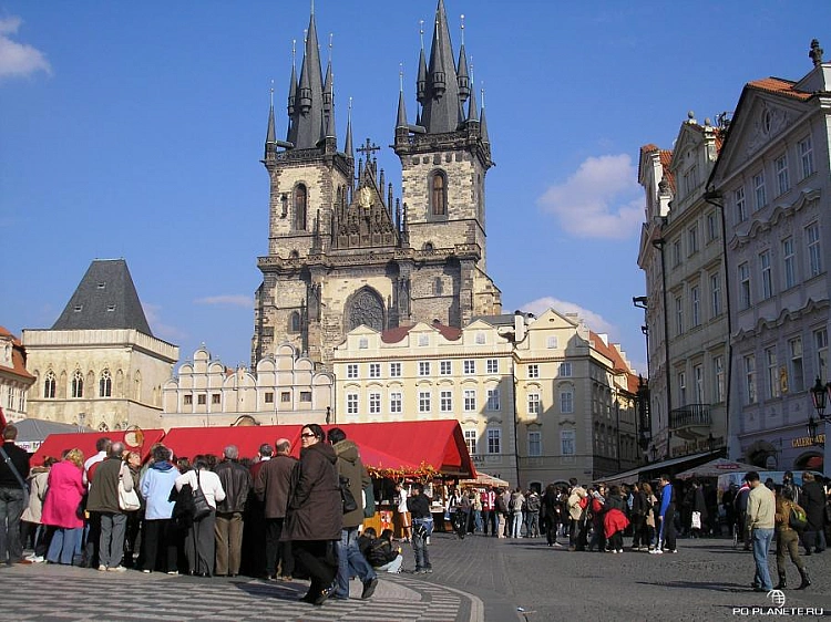 На Староместской площади что ни здание, то памятник истории и архитектуры. Самое же знаменитое строение, которое можно встретить на всех открытках и картинах – Церковь Девы Марии перед Тыном (то есть, перед рынком).