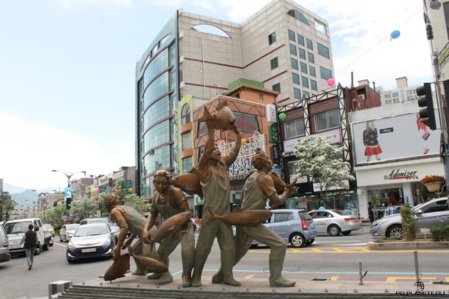 Нас отвезли в гостиницу и сказали, что есть 2 часа на прогулку. Все дружно высыпали на улицу и пошли вслед за переводчицей. Товары у них продают не только в самих магазинах - для привлечения покупателей образцы выставляют на улице. В самом центре города стоит памятник рыбакам, в знак благодарности за их нелегкий труд.