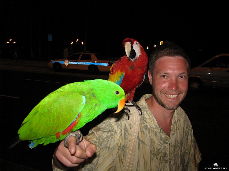 Отличные новости, друзья! На каждого нового туриста на Гавайях надевают гавайскую рубаху и двух попугаев!