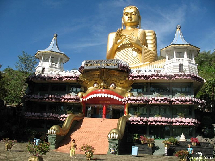 На Шри-Ланке, южнее Сигирии, в местечке Дамбулла (Dambulla) на вершине горы (350 метров над уровнем океана) находится буддистский пещерный храм, состоящий из 5 пещер. Здесь собрана самая большая коллекция статуй Будды, многим из которых уже более 2000 лет. Взгляд посетителей не может не остановиться на фресках, украшающих стены и потолок - это настоящая сокровищница настенной храмовой живописи. С левой стороны на потолке отображены главные моменты жизни Будды: его рождение, отречение от царской жизни, прозрение, семь недель после озарения, чтение первой проповеди, уход в блаженство Нирваны... Остатки штукатурки со следами краски снаружи пещер указывают на то, что храм представлял собой сплошную галерею живописи. Храм датируется 1 в. до н.э., но достраивался и восстанавливался в XII и XVIII веках. В XII в. храм был реставрирован во время правления короля Ниссанкамаллы, а 73 статуи Будды покрыты золотом. После этого храм стали называть "Золотой Пещерный Храм". В XVIII в. реставрацией живописи занималась династия живописцев, живших в окрестностях Дамбуллы. Потомки этой династии продолжают семейную традицию, используя старинные инструменты и рецепты приготовления пластыря из натуральных красителей. Храм находится под охраной ЮНЕСКО.